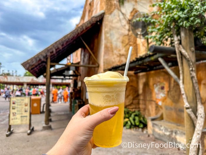 Over at Tamu Tamu Refreshments in Animal Kingdom, you can get boozy Dole Whips, and we were pretty thrilled when we found out that the Dole Whip Pineapple Hard Cider Float counts as a snack credit! It’s Dole Whip Pineapple served with ACE Pineapple Craft Cider. This a light and refreshing drink — also, we love how it foams up!