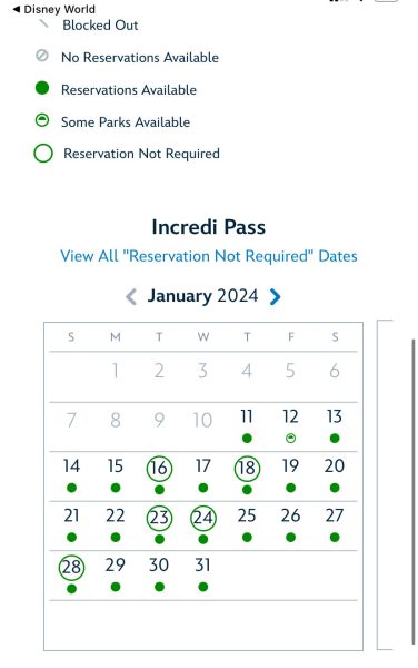 Those “Good-to-Go” days show up on the Annual Passholder calendar, so you can plan when you want to visit and see whether you’ll need a Park Pass. Note that you can’t really plan very far ahead — Disney has stated that they’ll update the calendar with more “Good-to-Go” days “days or weeks in advance,” so they’re not really giving us a ton of heads up. Right now, we can only see “Good-to-Go” days through February 1st.