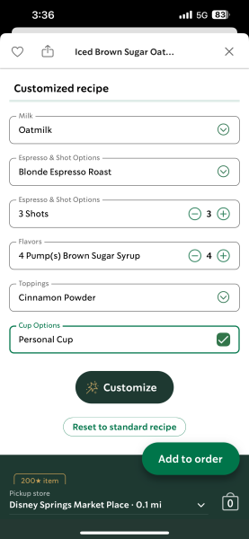 However, you CAN use a reusable cup at the Disney Springs Starbucks locations, where you can also use Starbucks’ mobile order (which isn’t available in the parks). When you use the app, you’ll see Personal Cup as an option — if you use your own cup, you’ll also get the discount there.