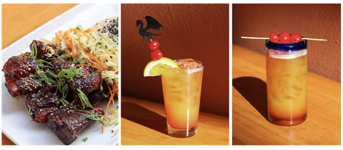 - Dragon Cocktail: Dragonberry rum, white rum, lychee nectar, dragon fruit and Chinese five-spice syrups, lime juice, and house-made coriander tea garnished with a dried dragon fruit wheel