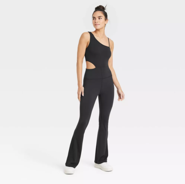 This full-length bodysuit is sleeveless and features an asymmetrical neckline, side cutout, and a flared leg cut. It’s made of stretchy fabric with an adjustable strap and is offered in 3 solid colors.