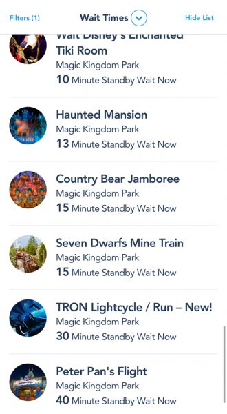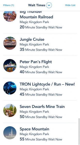 At 11PM, the wait times were looking low! Haunted Mansion was sitting at a spooky 13-minute wait, while TRON went down to 30 minutes!