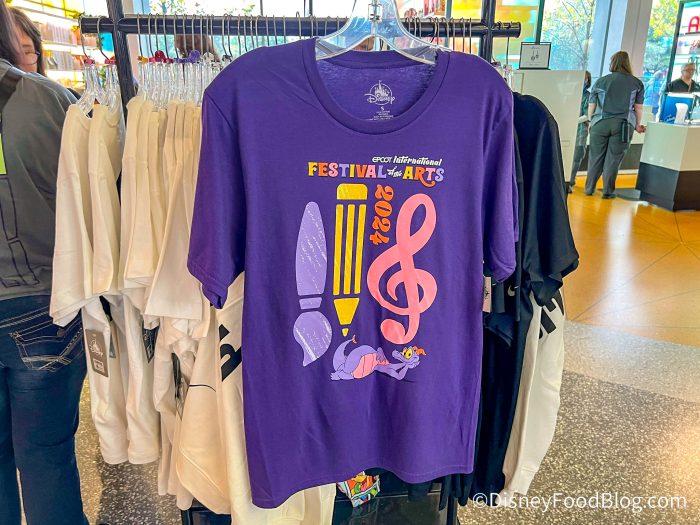 If a tee is more your thing, there’s an EPCOT Festival of the Arts T-Shirt. Yep, it’s purple with a fun front design on it. It’s $34.99.