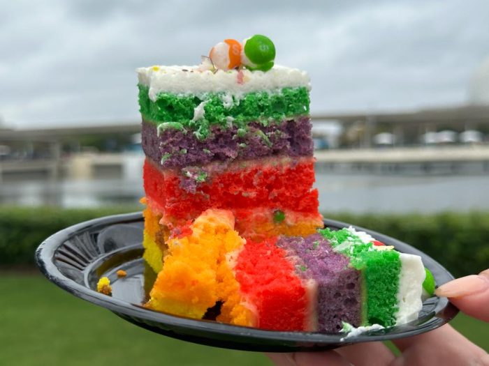The cake is layers of vanilla cake dyed in different colors. The standout flavor in the dessert are the Skittles flavors between each layer of fluffy cake. It’s a nice cake, but we had hoped for more flavor in each of the layers of actual cake instead of just vanilla. However, it’s still delightful and not overwhelmingly sweet, even with the layers of Skittles.