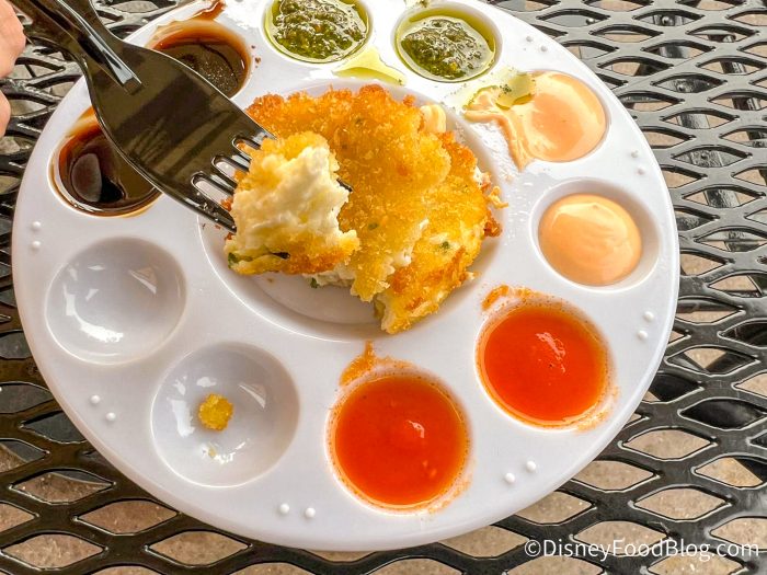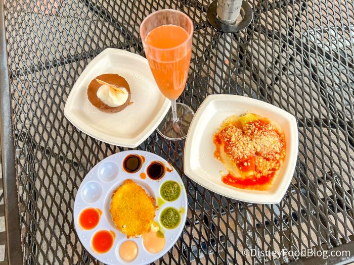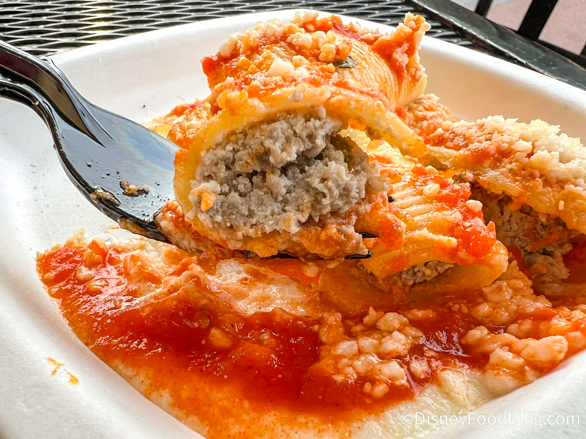 The filling inside the pasta was a little bland — we felt it needed more salt. The creamy sauce on the bottom was like a whipped ricotta. The topping was just a basic Pomodoro sauce with grated Parmesan cheese. Is this EPCOT Festival of the Arts-worthy food? We’re going to say “nope.”