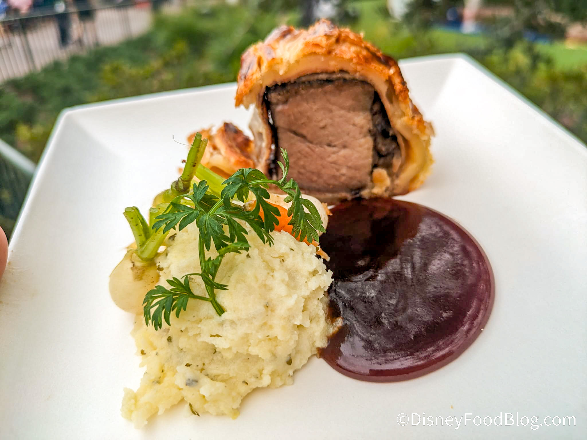 First up, we grabbed the Beef Wellington. This item is made up of Mushroom duxelles, prosciutto, and puff pastry with red wine demi-glace. This costs $8.75. This is one of those dishes that we’ve heard a lot of people raving about, and we can say it lived up to the hype. Well, sort of?