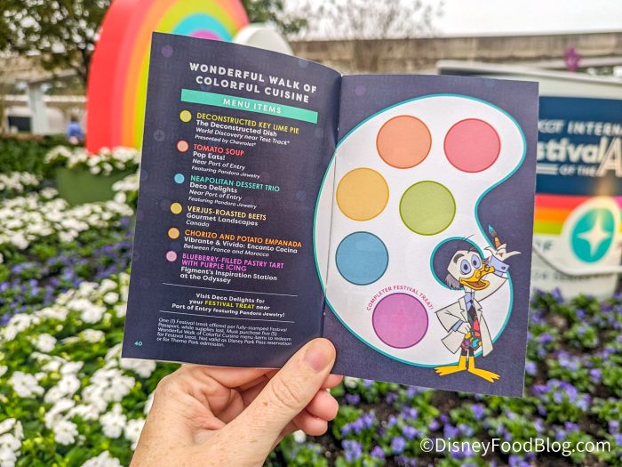 The Wonderful Walk of Colorful Cuisine is like a mini bucket list of snacks and treats to try during the EPCOT Festival of the Arts. Inside your EPCOT festival passport, you’ll find a list of dishes that are part of the Wonderful Walk of Colorful Cuisine, and you must purchase five of the qualifying menu items to get a free prize.