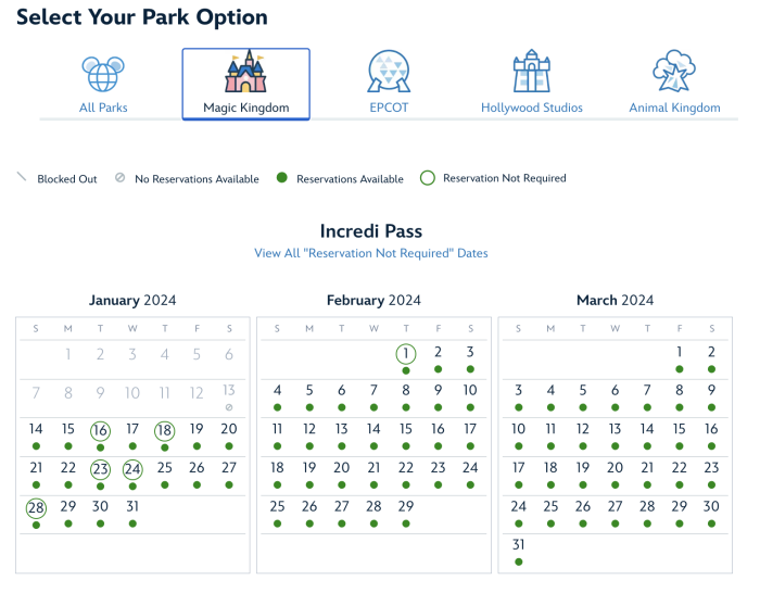 So you may know that Disney World Annual Passholders are still required to make Park Pass Reservations, except for days that Disney deems as “good-to-go.” Well, today, January 12th, is NOT one of those days, so Park Pass Reservations are required for Annual Passholders — and we just noticed that Magic Kingdom is completely SOLD OUT for the day for those with an IncrediPass and Sorcerer Pass (the other two tiers of Annual Passholders are already blocked out).