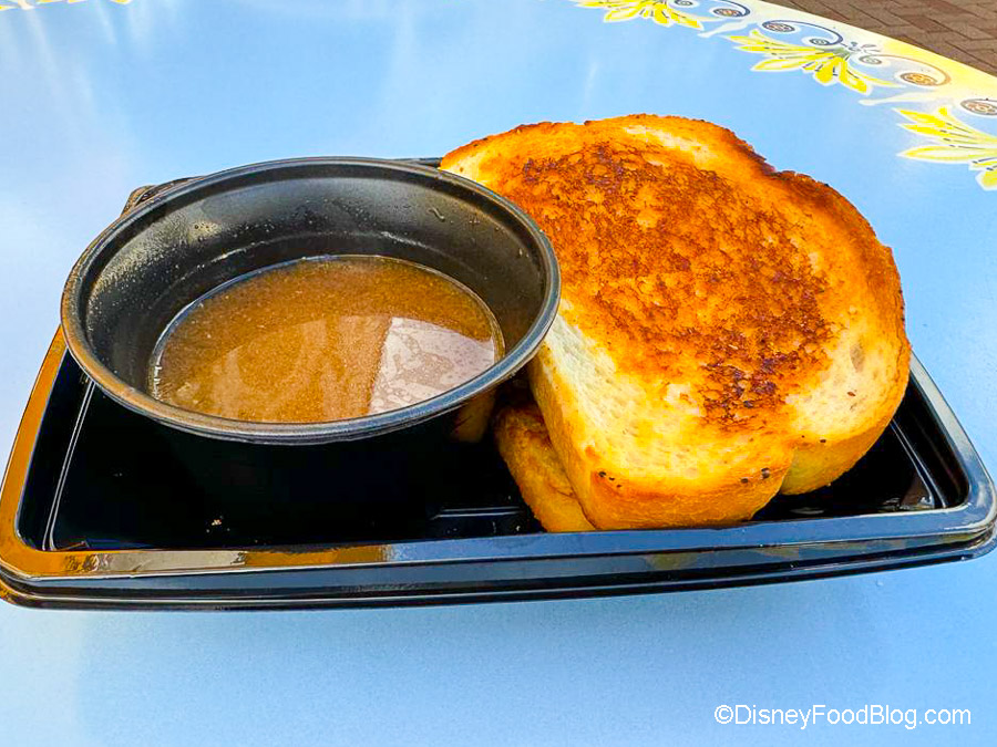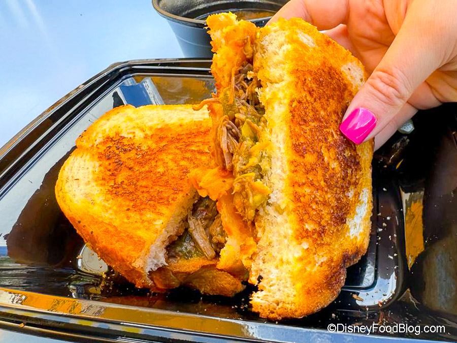 For $14.99, you get a Toasted Cheese Sandwich with Beef Birria, along with Pepper Jack, Onion, Cilantro, and Salsa Verde on Sourdough Bread, plus Consommé to dip it in. We’ll tell you now — this is still our #1 sandwich in Disneyland. The flavors and spices are ON POINT, with tender meat and the perfect amount of tang coming from the salsa verde. The Consommé is also flavorful, and when you dip the sandwich in it, it just all comes together perfectly.