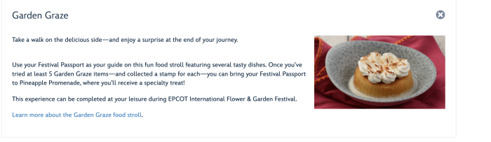 But wait — there might be one more confirmed booth! Under the Garden Graze section of the Disney World Flower & Garden page, we spotted this notification that seems to confirm that the Pineapple Promenade booth will return in 2024 as well!