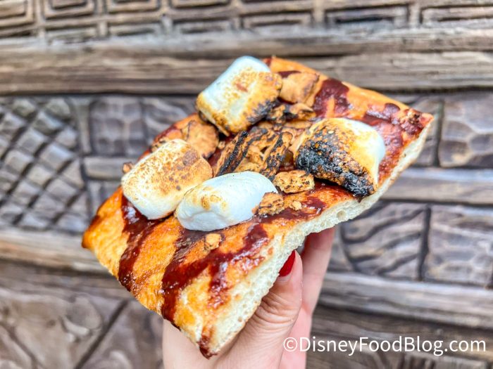 We had multiple people ask us where we got it from! This slice was rectangular and as big as our hand — it’s an easily shareable treat and for $6.79, that’s a good deal in Disney World. Marshmallows are dominant on the top of this pizza, so if you’re not a fan you might want to skip this.