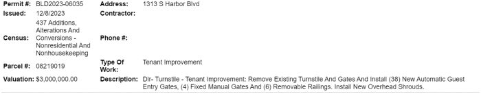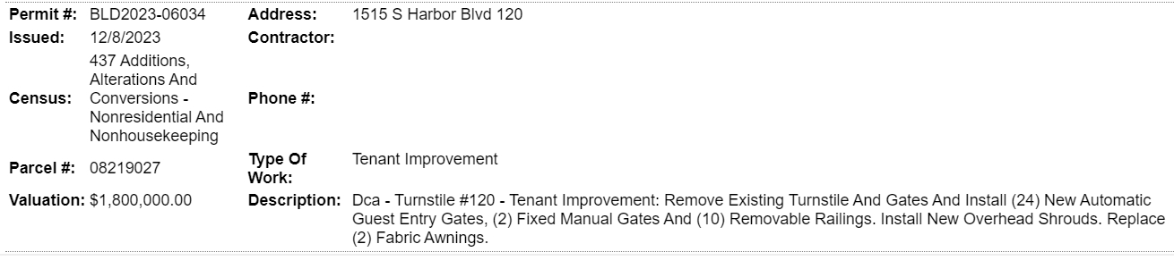 The description of the Disney California Adventure permit is pretty similar and says Disney is going to “Remove Existing Turnstile And Gates and Install (24) New Automatic Guest Entry Gates, (2) Fixed Manual Gates, And (10) Removable Railings. Install New Overhead Shrouds. Replace (2) Fabric Awnings.” This project is valued at $1.8 million.