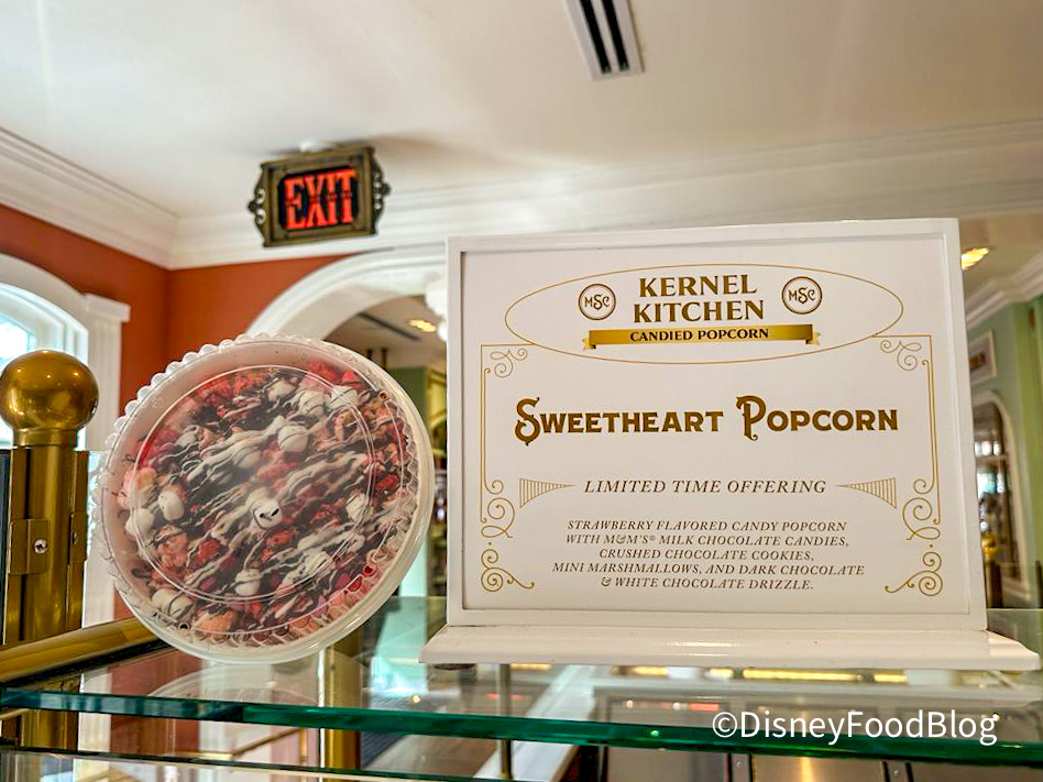 One of our favorite places to grab a treat is at the iconic Main Street Confectionery in Magic Kingdom. Here, you can choose from a seemingly endless array of treats, from popular Mars Wrigley candies, to crisped rice treats, to cupcakes, cookies, marshmallow pops, and MORE. One of our favorite things to do here, though, is visit the Kernel Kitchen popcorn station at the very back of the shop. Cast Members will allow you to customize a bowl of popcorn with candies and syrups, and you can even opt for one of Disney’s popcorn mixes. They make it right in front of you, and it’s pretty cool. There’s a new popcorn mix that’s up for grabs right now, and we’re headed to check it out.