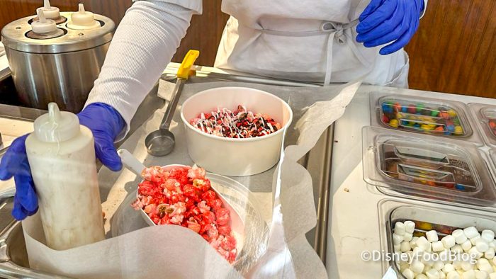 As we were watching them prepare our snack, we were starting to get a little iffy about the strawberry popcorn. We’re all for a sweet and salty combination, but strawberry? This should be interesting.
