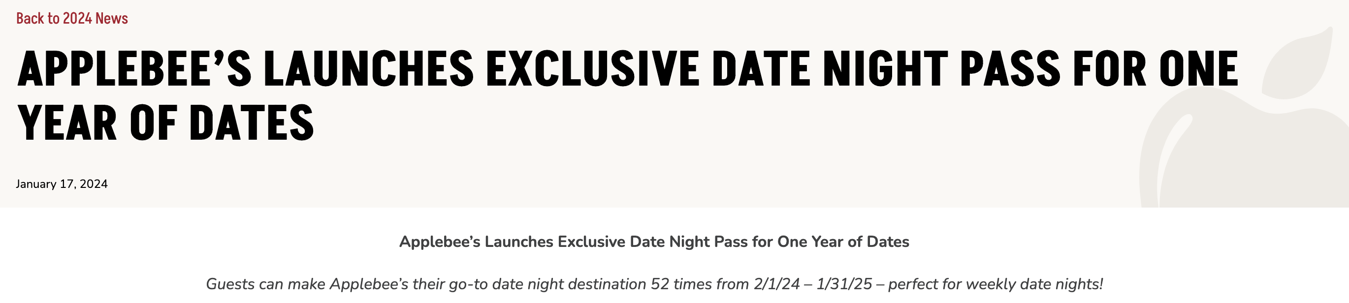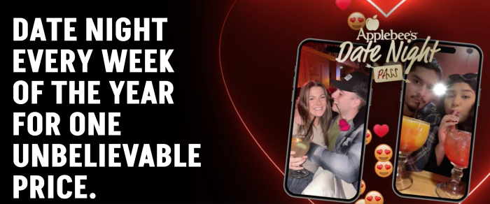 Applebee’s, a popular restaurant chain with locations all over the U.S., has launched an exclusive Applebee’s Date Night Pass that will give couples 52 visits to the restaurant for ONE price!