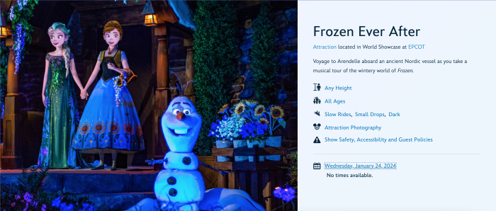If you think you’ll develop “Frozen Fever” from being without Frozen Ever After too long, you won’t have to wait as long as you think. The scheduled routine maintenance closure is set to start on January 24th, 2024, and might be the most brief maintenance closure we’ve seen in quite a while.