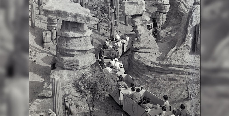 Now, as Bob describes, this tunnel didn’t always lead to nowhere. For years, a train ran through it that went around Big Thunder Mountain (before it was Big Thunder). That attraction was called the Mine Train through Nature’s Wonderland. It featured all sorts of lifelike animals like bears and wildcats. It was later removed to make way for Big Thunder Mountain.
