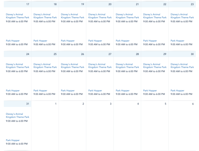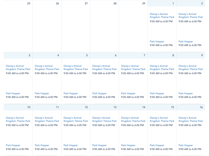 Animal Kingdom is scheduled to be open from 9AM to 6PM every day in March.