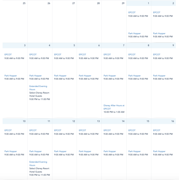 EPCOT is currently scheduled to be open from 9AM to 9PM every day in March.