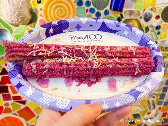 The churro certainly gets some points for style — just check out the mix of pinks, purples, and whites from the sugar and icing! You’ll totally stand out from the “regular” churro crowd with this one. In terms of taste, though, it was literally just like a regular Disneyland Churro topped with coconut.