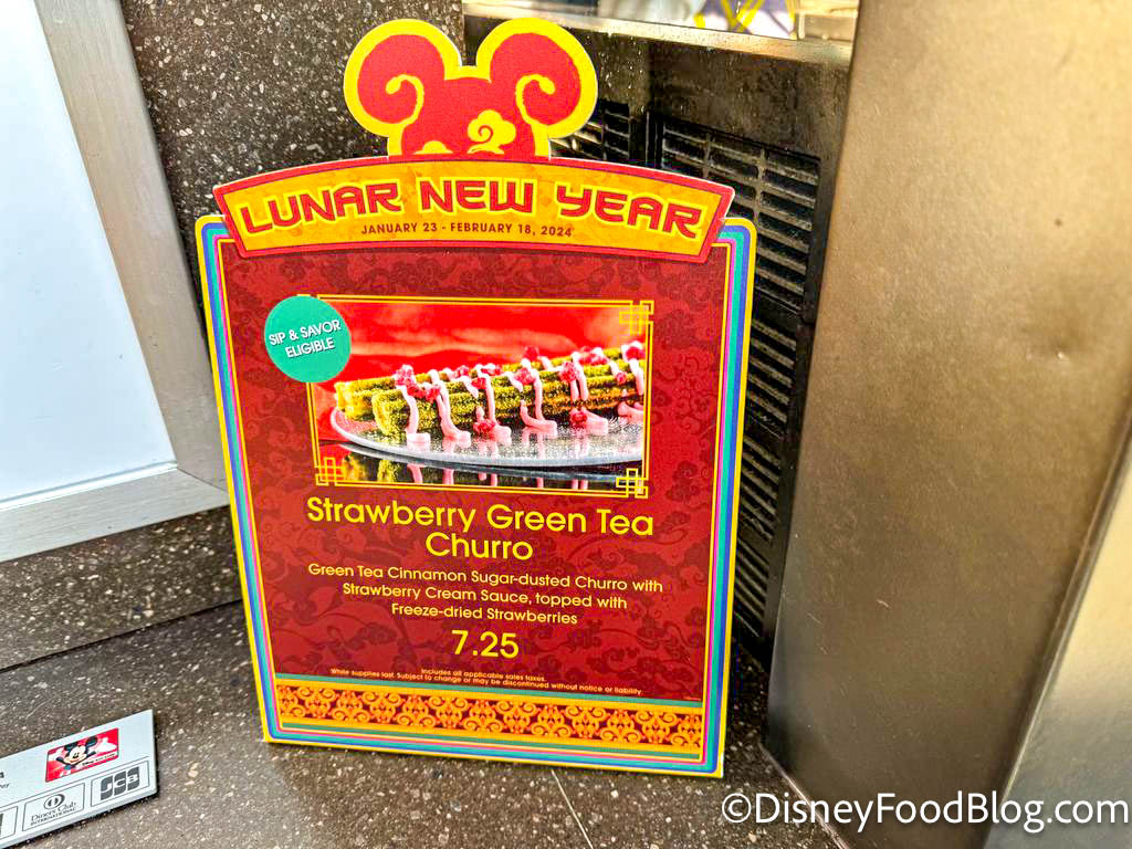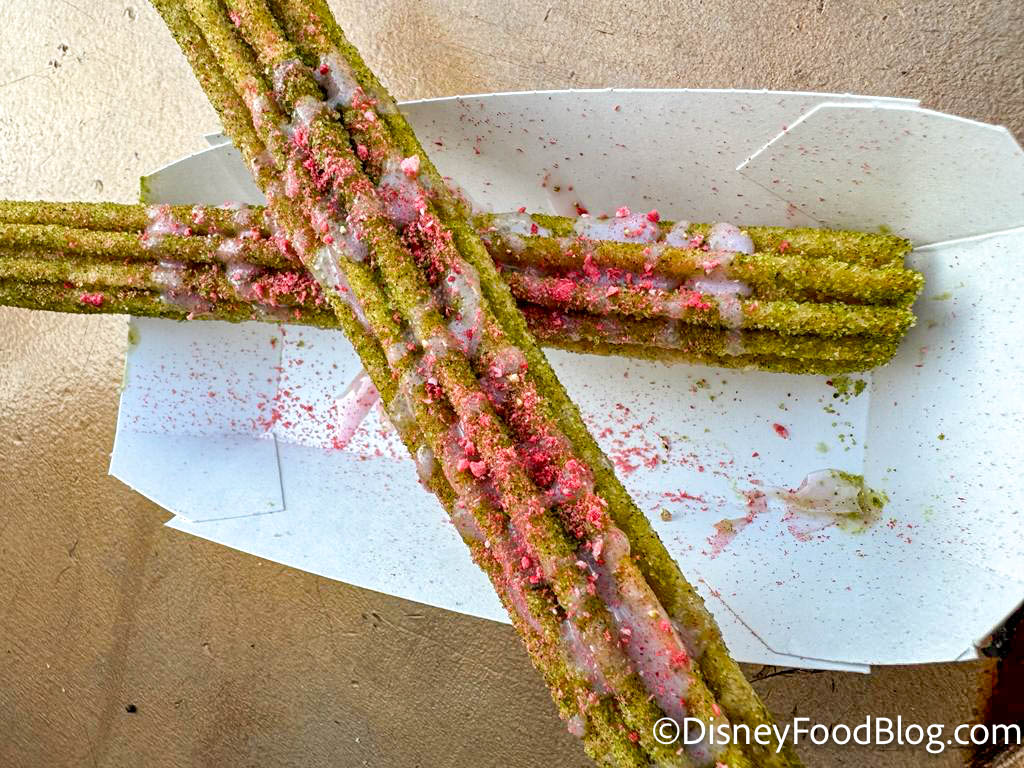As we mentioned above, you’ll find this new churro over at Terran Treats, a snack stand that operates year-round in Avengers Campus. The special Lunar New Year Festival churro that’s featured here is the Strawberry Green Tea Churro!