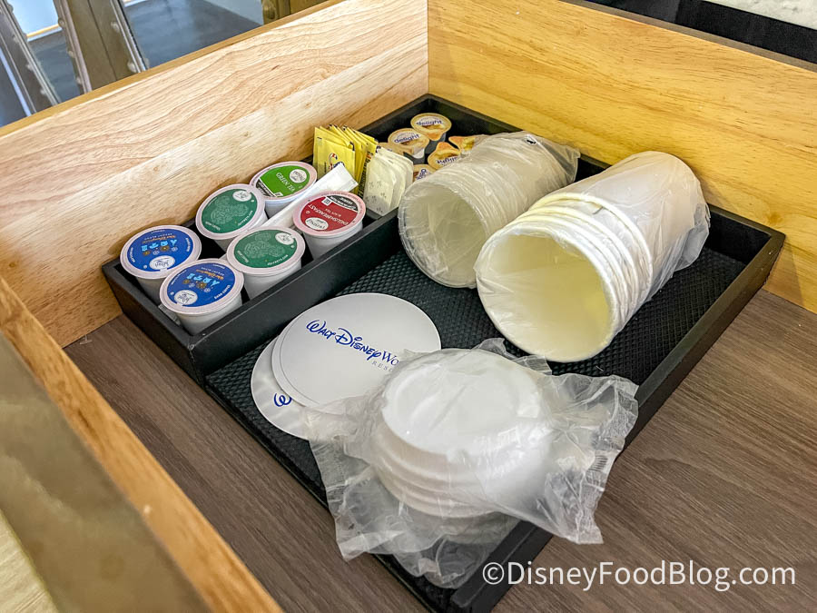 To our left before reaching the beds, we see the coffee station. Have a look at the artwork featuring the hotel and Mickey and Minnie picnicking in front of it: