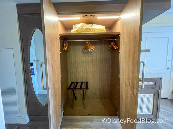 There are three big closet doors to the left where you’ll find your normal storage and extra pillow and blanket…