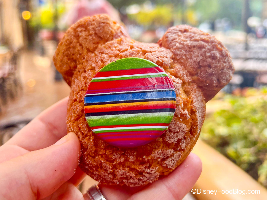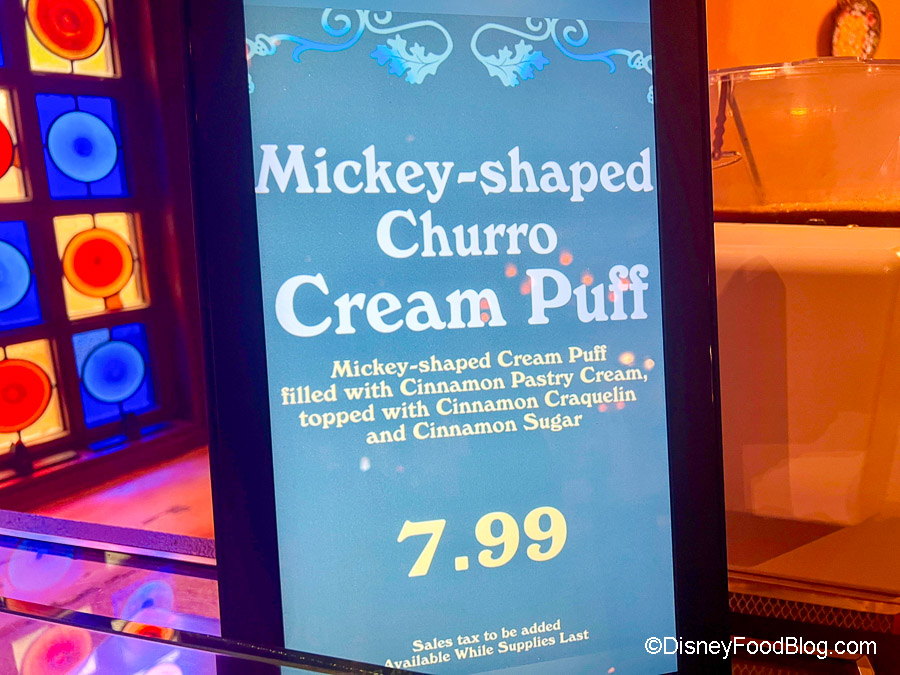 For $7.99, you get a Mickey-shaped churro cream puff filled with cinnamon pastry cream, topped with cinnamon Craquelin and cinnamon sugar. Cream puffs can go stale SO fast, but this treat is kept refrigerated, so it’s nice and soft when you get it. But does it taste like a churro?