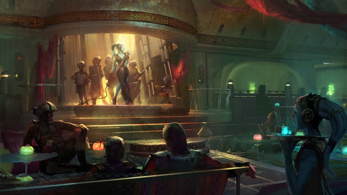 Oh, hmmm…that looks familiar, doesn’t it? If you followed our coverage of the Star Wars: Galactic Starcruiser, you might remember that we watched a show in the Crown of Corellia dining room with a Twi’lek singer (just like in the concept art. So Disney already knows how to make this idea work, so why not bring the idea back for Star Wars: Galaxy’s Edge?