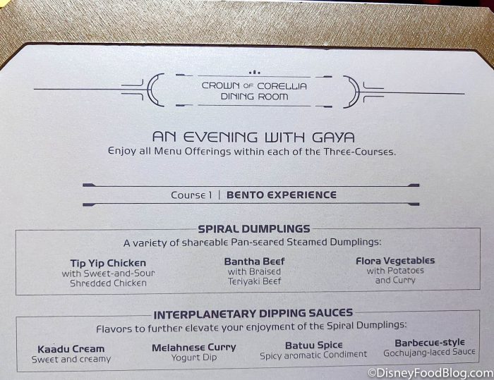 Imagine a table service restaurant in Galaxy’s Edge, though, with a specialized menu that goes above what you can get at Docking Bay 7 and Ronto Roasters. In fact, we don’t even have to imagine it too hard because we had a chance to dine in the Crown of Corellia Dining Room several times on the Star Wars: Galactic Starcruiser (aka the Star Wars hotel) before it closed.