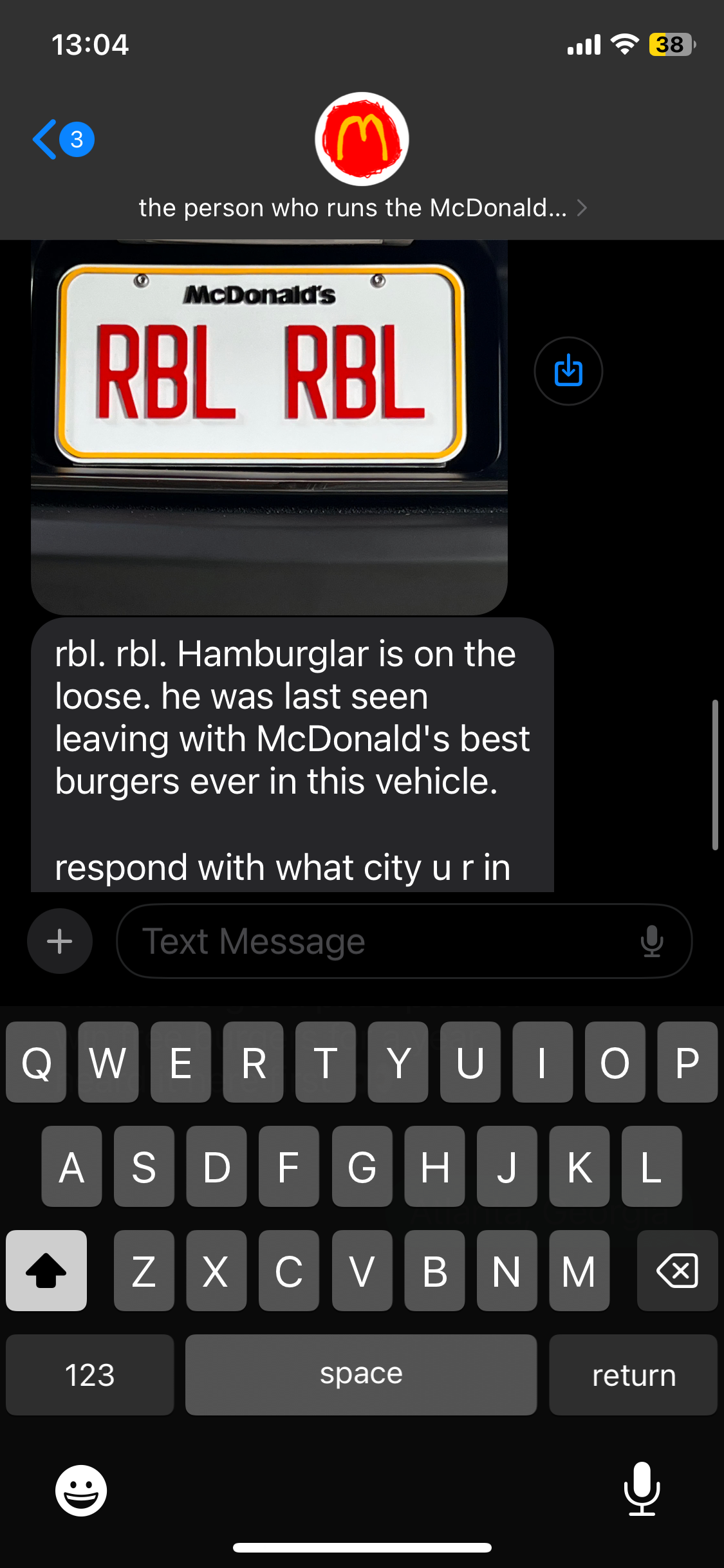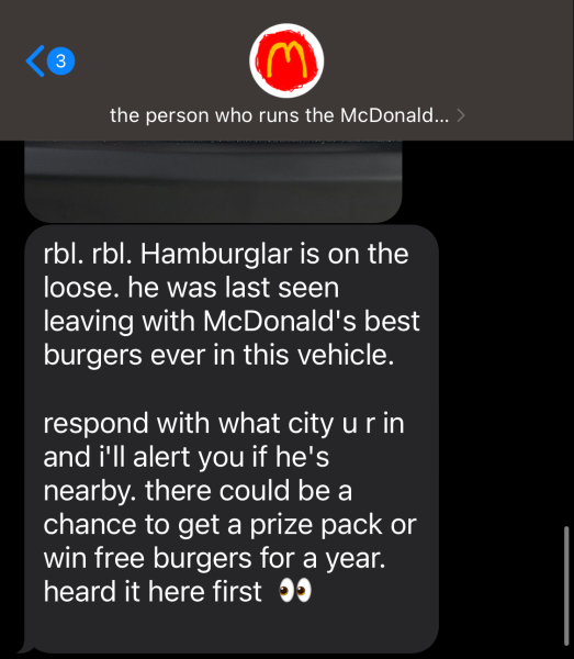 When we heard our phone ding, the last thing we expected was a McDonald’s text telling us that the Hamburglar is on the loose! He was last seen riding away with McDonald’s best burgers in a car with the license plate RBL RBL. Be on the lookout!