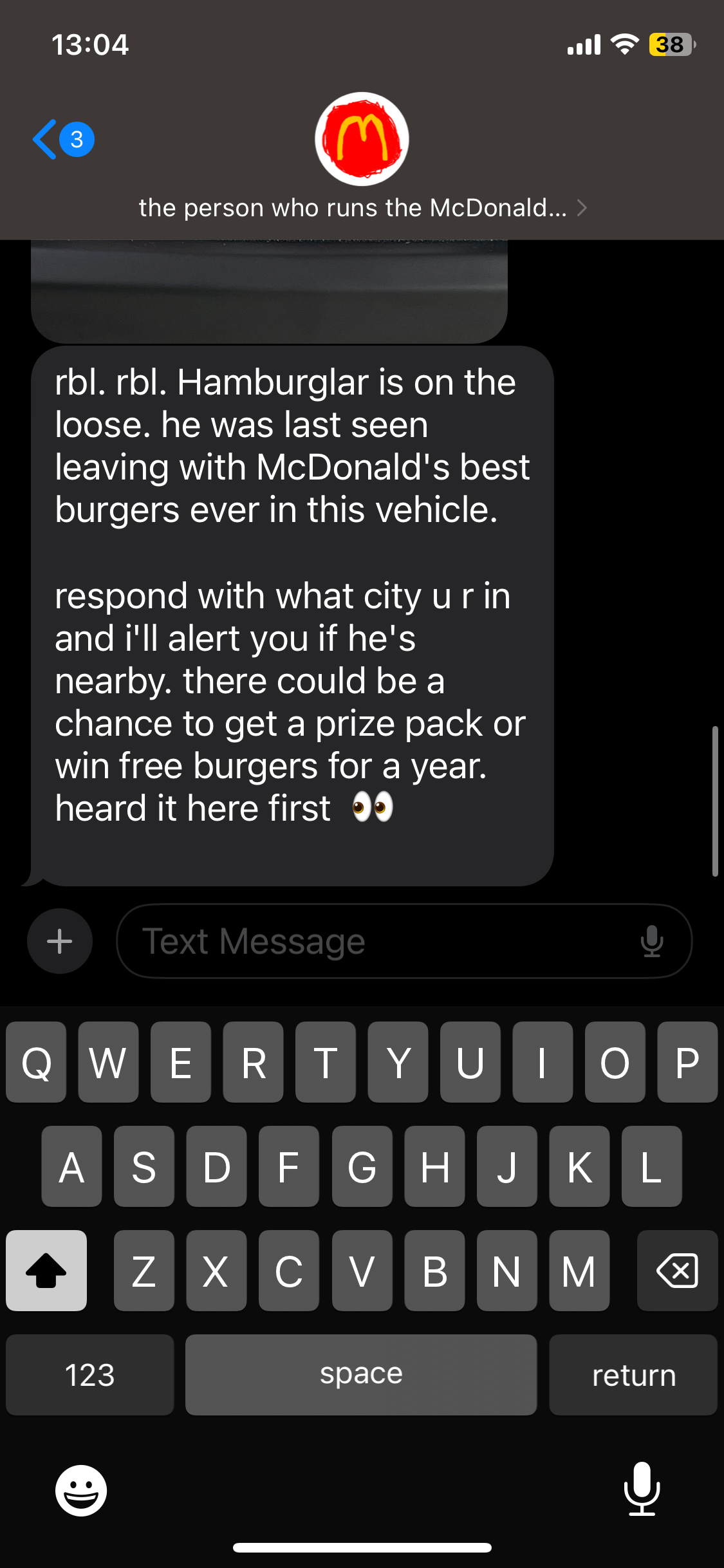 The text asks you to text back the city you’re located in, and McDonald’s will tell you if he’s nearby. You could potentially win a prize pack or free burgers for a YEAR!