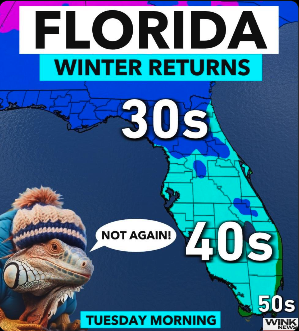 The cute little lizard friend softened the blow of the news for us. He was looking pretty cute in his little snow hat. But for real, we’ve got another lizard warning on our hands for the next couple of days!