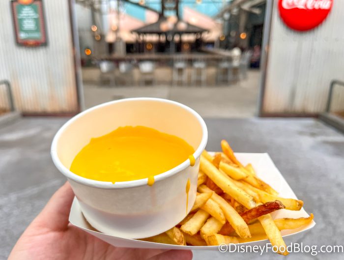 We LOVE Plastic Cheese! That’s our affectionate name for the little cups of cheese sauce you can find at some quick service spots around Disney World, but it’s NOT the same as the cheese sauce that you get prepackaged when you buy a Mickey pretzel. This cheese has a richer cheesy flavor and it’s usually served warm instead of cold and goopy.
