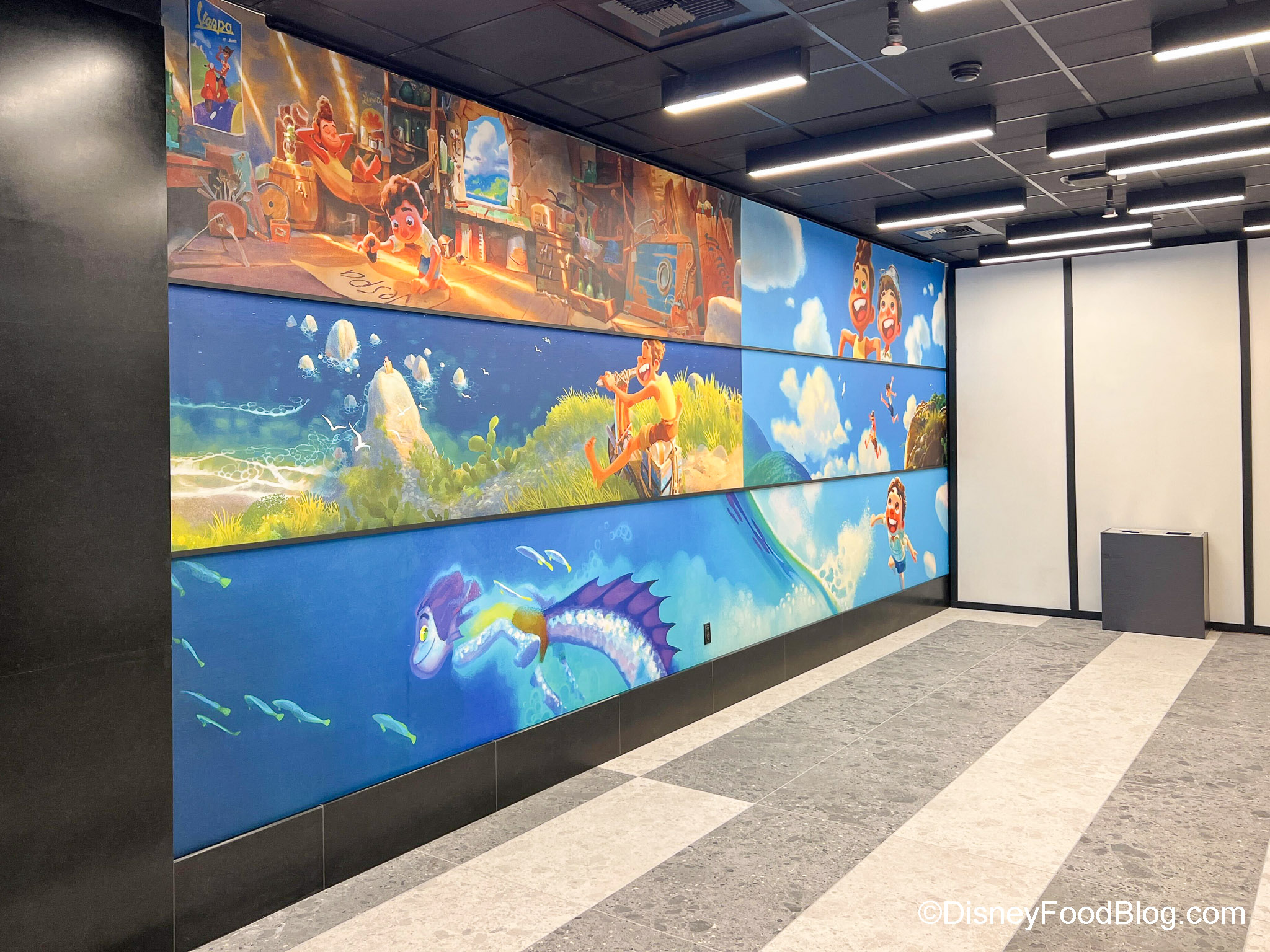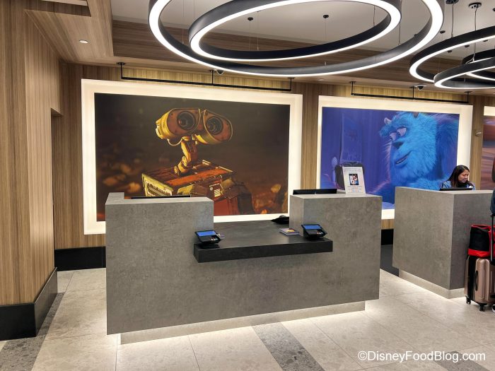 The check-in area looks great with sleek new desks, updated lighting, warm wood paneling, and gorgeous Pixar pictures in the background. There are also details on the floor!
