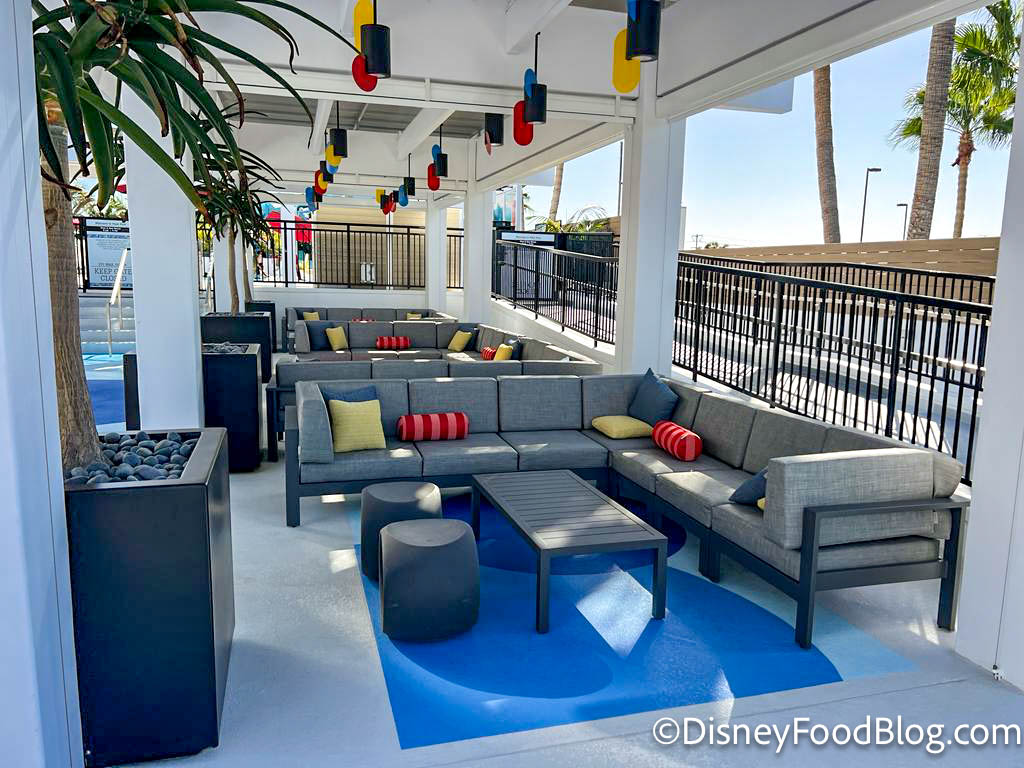 The outdoor seating is spacious yet cozy, and follows a more subtle Pixar theming. The colors remind us a lot of the classic Pixar films like Toy Story. We also like that the areas all have lighting, so that you can see if you’re spending an evening at the pool.