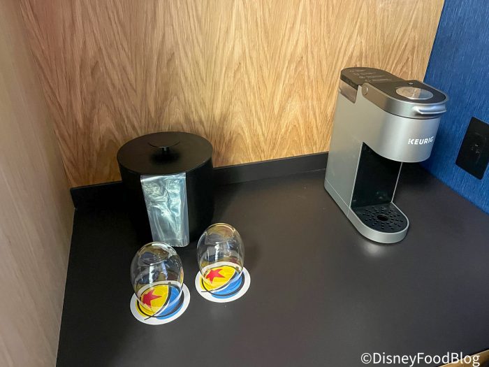 As we stepped into the entry way, we were met by a small coffee nook complete with an ice chest. Did you notice the Pixar ball coasters?