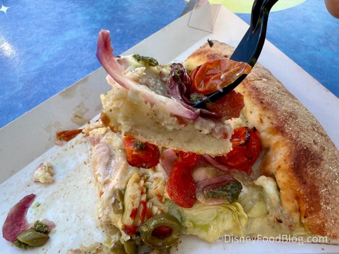 Let’s start with the Artichoke and Pesto Pizza slice at Alien Pizza Planet! This slice costs $8.99 and is made with artichoke hearts, pickled red onions, mixed olives, tomatoes, feta cheese, and mozzarella with Parmesan, served with an Alfredo cream sauce and pesto drizzle.
