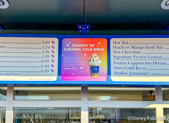 We arrived in EPCOT bright and early to try out the new Figment of Caramel Cold Brew. This drink can be found at the Joffrey’s Coffee stand located near the front entrance to the park.