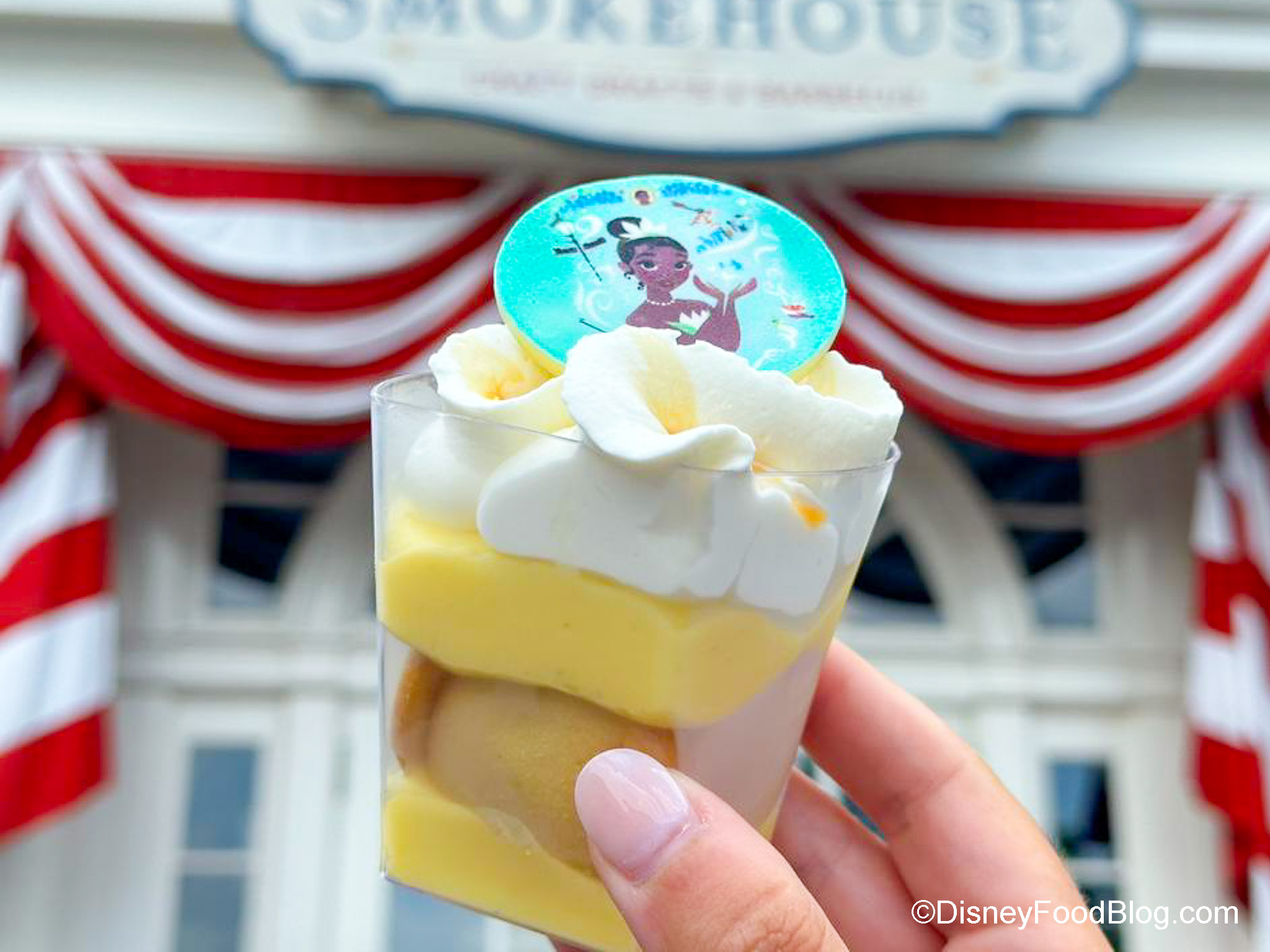 The banana pudding has been available at Regal Eagle on and off for a while now, and every once in a while, Disney gives it a little Tiana-inspired makeover with some decor on top. We saw the white chocolate decor added last year for both World Princess Week and Black History Month.