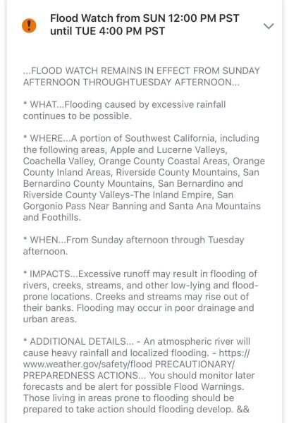 Additionally, meteorologists are warning California residents to prepare for damaging winds with gusts between 60-80 mph on Sunday. A flood watch is currently in effect in Southwest California, including Orange County, which is where Disneyland Resort is located.
