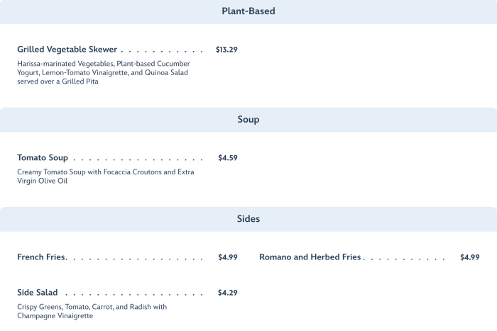 The one main plant-based option is the Grilled Vegetable Skewer, and then the list of sides includes tomato soup, fries, side salads, and of course, their signature Romano and Herbed Fries.