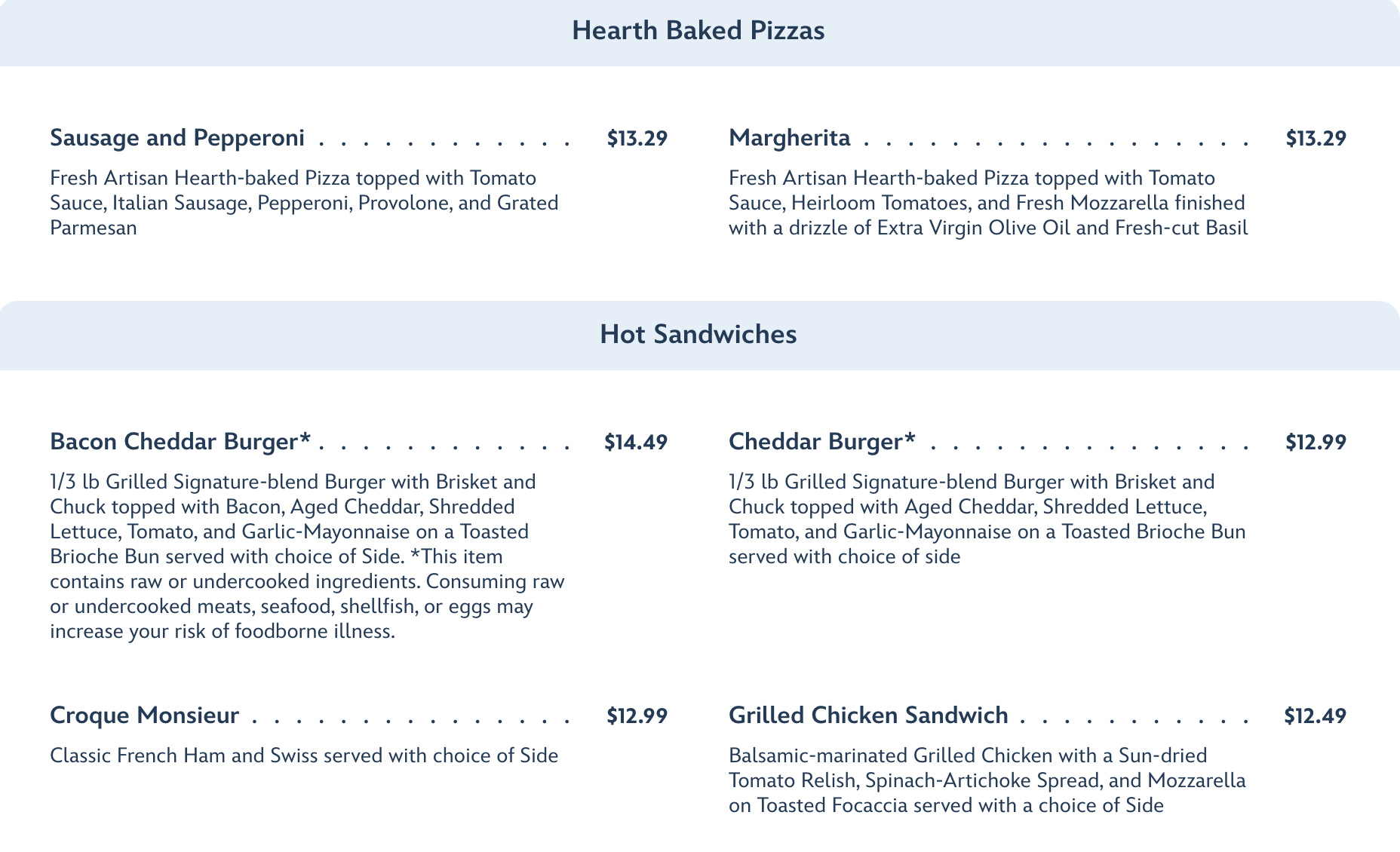 First up, we’ve got the Sausage and Pepperoni Pizza for $13.29. It’s a hearth-baked pizza topped with tomato sauce, Italian sausage, pepperoni, provolone, and grated parmesan.