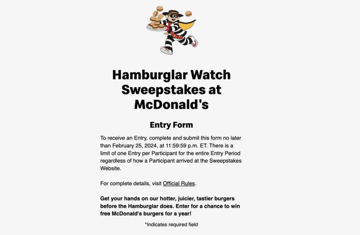 To enter to win free McDonald’s burgers for an entire year, you just have to visit the Hamburglar Watch Sweepstakes website, enter your information, and hit “Submit”! See? Told ya it’s easy.