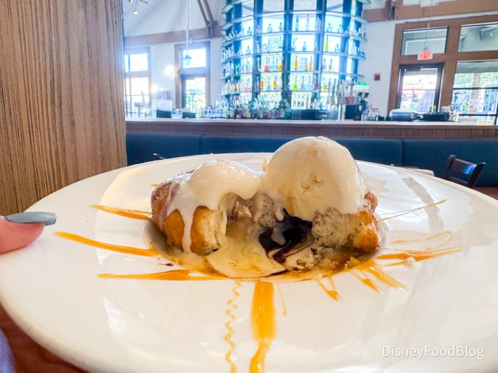 We were kind of obsessed with this. We love a fun take on a churro — especially at Disney. This was everything that you love about a churro, but in a donut form. It was very sweet and the ice cream added a great touch. There is chocolate and caramel sauce hidden underneath the donut, so make sure you don’t miss it when you’re eating it. The sauces provided a great source of flavor and we really enjoyed it — especially the caramel.
