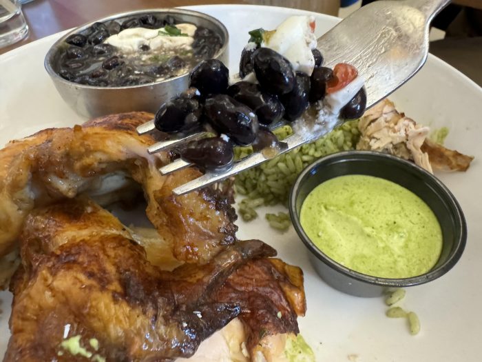 Now, it is time for the main course! We got the Peruvian A La Brasa Rotisserie Half Chicken, which came with half chicken, cilantro rice, and black beans with lime crema. It is on the menu for $29.