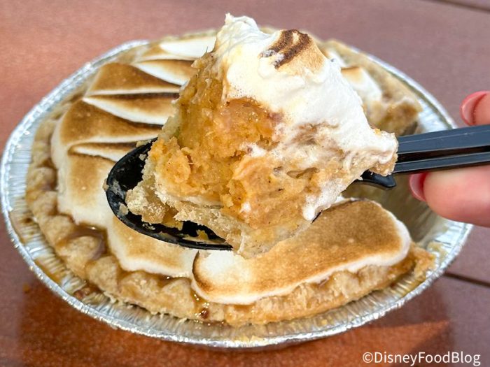 Then it was time to move on to the second item we picked up — the Sweet Potato Pie. This pie comes topped with toasted marshmallow cream and candied pecans; however, ours was missing the candied pecans. We picked this one up for $5.99.