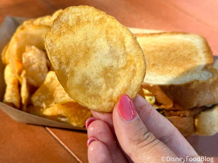The side served with this one is house-made chips. Disney’s started serving these more often with entrees that we find mostly around the Disney World hotel lounges and restaurants, so we were surprised to see them make their way to Pecos Bill with this meal. Since Pecos Bill doesn’t tend to serve fries, it made sense for this restaurant to offer a different kind of side with the sandwich.