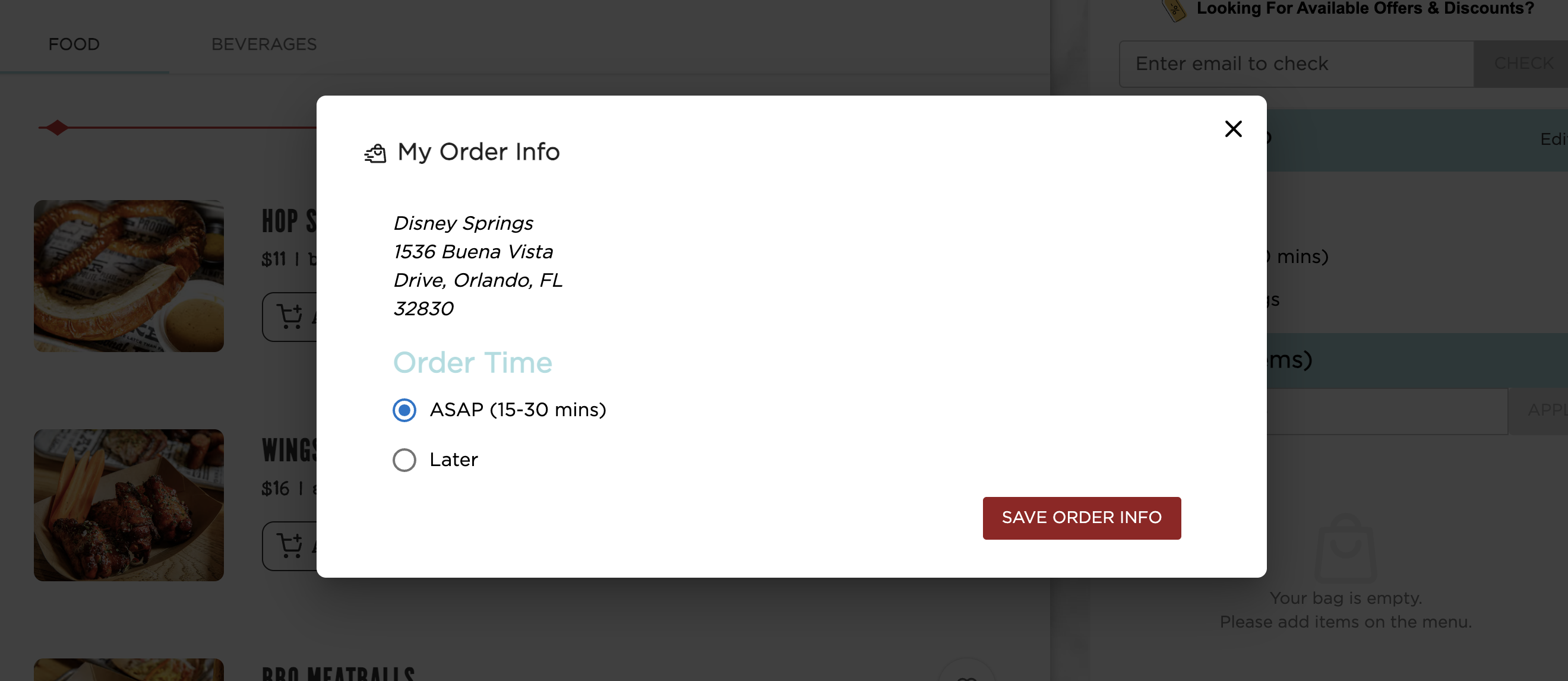 You can choose to pick up your food ASAP and they’ll give you an estimate for how long you’ll have to wait to pick it up — or you can schedule your order to be picked up at a later date and time.
