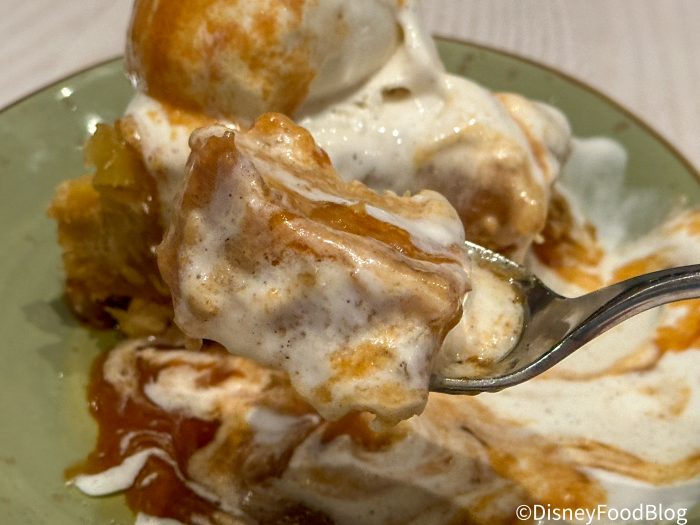 If this treat looks familiar to you, you’re not wrong. It’s also served at the neighboring Banana Cabana Pool Bar & Lounge and as a sister version (sans coconut) at ‘Ohana, Tambu Lounge, and Kona Cafe (even Kona Cafe To G0.) It’s paired with a signature caramel sauce and vanilla ice cream. We drizzled that warm caramel sauce (read that as poured the whoooole thing) on top of the bread pudding and cold ice cream and got to work!